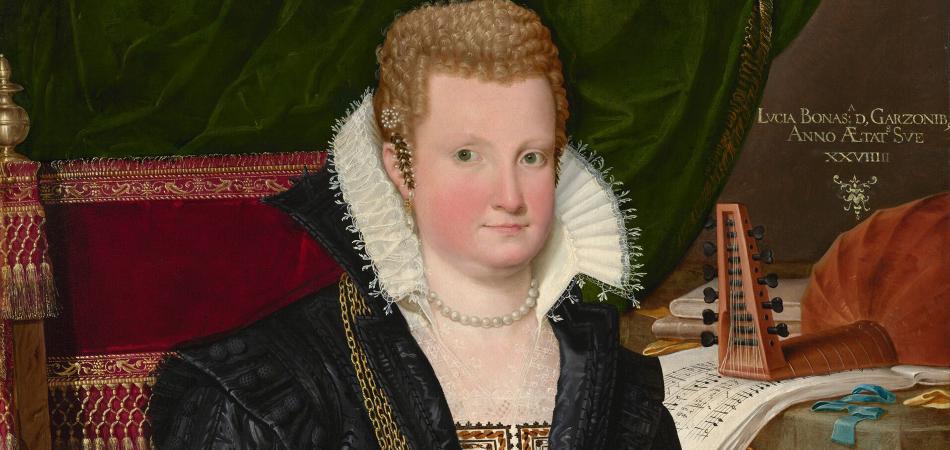 Sitting proudly in the foreground, the 16th-century musician and noblewoman Lucia Bonasoni Garzoni is dressed in her finest jewelry and an exquisitely embellished gown.