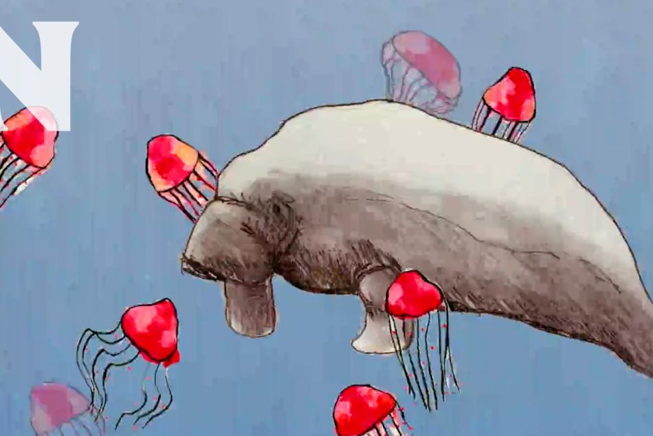 Avish Khebrehzadeh made thousands of drawings to create her animated video Seven Silent Songs. She digitized, edited, and set the drawings in motion in six linked animations that loop to make a seventh overall work. Together, the serene scenes raise questions about migration, climate change, and human nature. The processions start and end with animals. Humans are interspersed to denote balance, cause, and effect. A long line of galloping white horses, symbolizing wisdom, power, and freedom as well as the artist’s native Iran, sets the tone. In other scenes, a man drags a whale, jellyfish and a manatee swim through a fluid environment, rhinos and birds meander through a field, and military figures on stilts drag cans and chairs behind them. A peaceful flight of herons ends the poetic series.