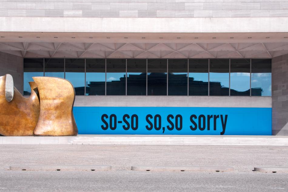 In her language-based artworks, Kay Rosen investigates how color, scale, material, composition, and typography affect meaning and structure. Her imaginative strategies challenge the way we see and interpret the texts we read. The artist created SORRY in response to the renovation of the East Building façade. She started with the word itself—an apology for inconvenience—and then isolated and repeated so. By combining the linguistic unit so with a comma and a hyphen, Rosen generates a range of expressions, from a half-hearted apology to a sincere one.