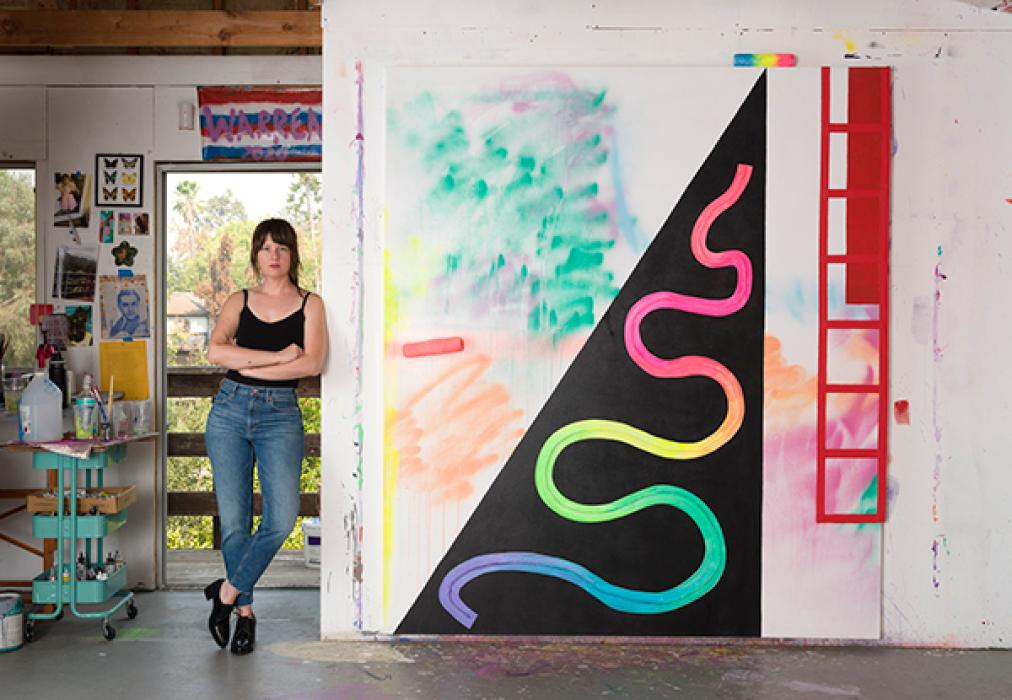 Sarah Cain in her Los Angeles studio with My favorite season is the fall of the patriarchy in progress, 2020. Photo: Jeff McLane