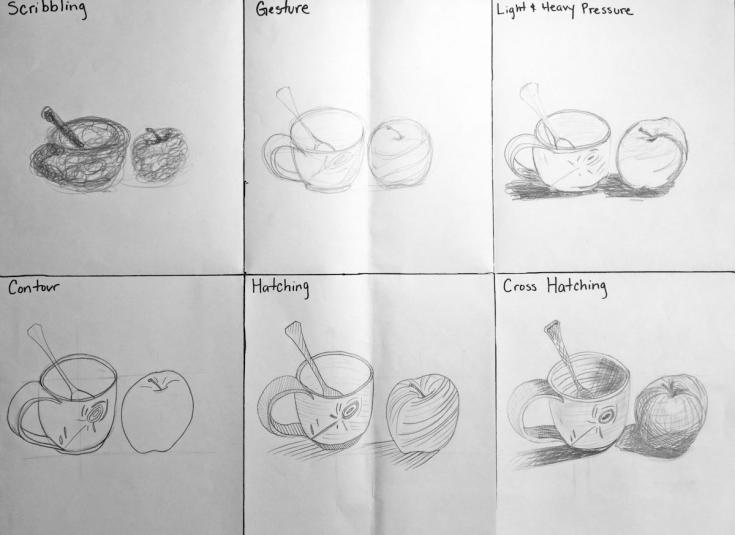 Dive deeper into the different techniques with a more extended drawing project. This longer project could be a self-portrait, larger still life, or landscape. Have students use at least two of the above techniques to complete their drawing. This is also an opportunity to add color with colored pencils, markers, pens, or crayons.