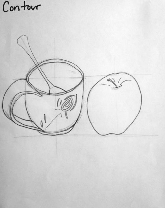 Contour drawing uses continuous long lines to convey an object's shape. The result is an outline. Try not to go over a line too many times. The repetition produces a scratchy effect instead of a continuous smooth line.
