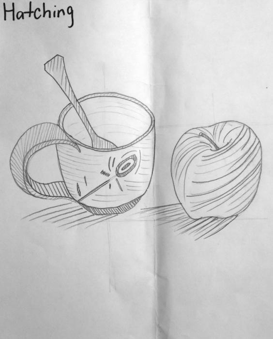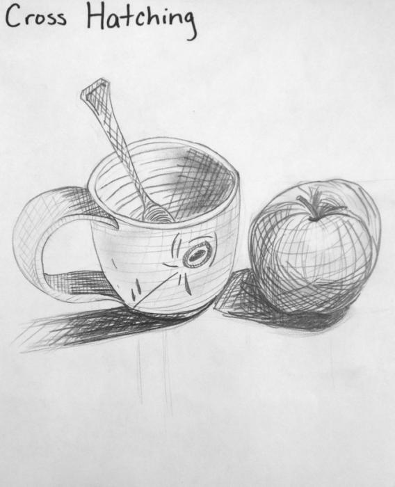 Use crosshatching to fill in objects on a third contour drawing. This technique lends a sense of direction in a drawing, for example, by making the apple appear round. Combine crosshatching with light and heavy pressure to add layers, texture, and shadows to objects in the drawing. Lightly erase areas to create highlights.