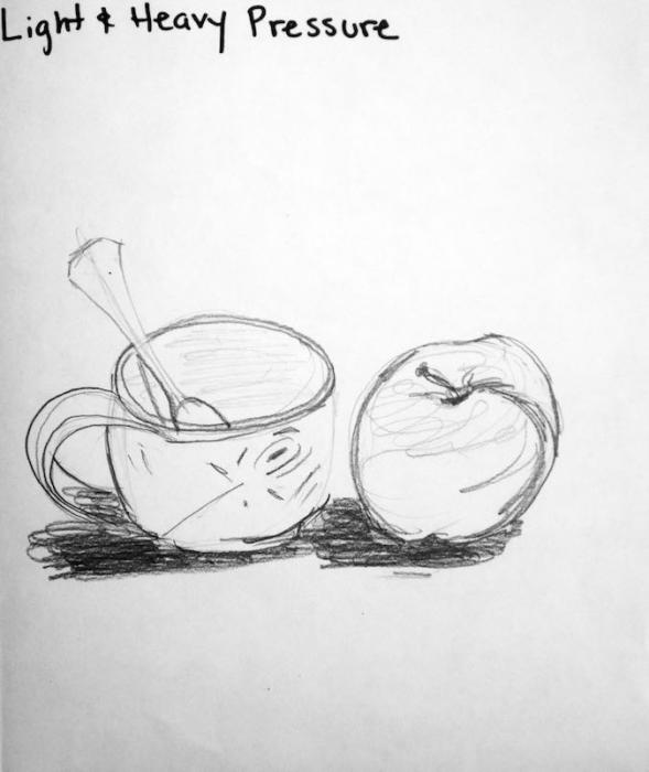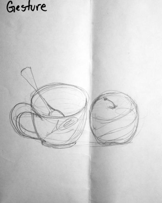 Next is gesture drawing. Again, work quickly to capture the overall shape on the object. Unlike scribbling, the motions are longer and are not always in a circular motion. Keep your pencil on the paper and sketch the objects in less than a minute.