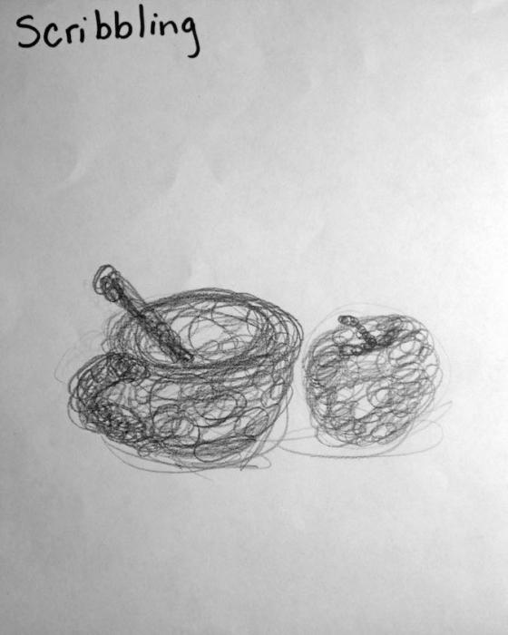 Begin with scribbling. Start in the middle of the object and make circular motions that move outward to capture the overall shape. Work quickly to complete this drawing in less than two minutes.