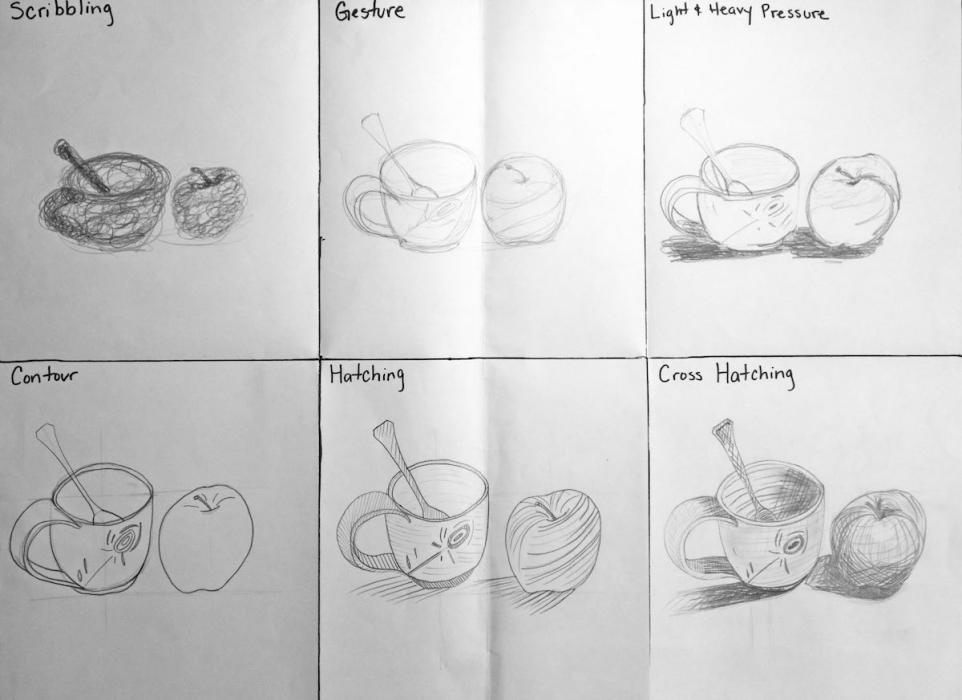 Divide a large piece of drawing paper (18 x 24 inches) into six rectangles of the same size. (You can also use six pieces of regular paper [8.5 x 11 inches].) Start at the upper left and draw the still life six times. Use one of the six techniques in each box: scribbling, gesture, light and heavy pressure, contour, hatching, and crosshatching. Notice the relationships between each technique.