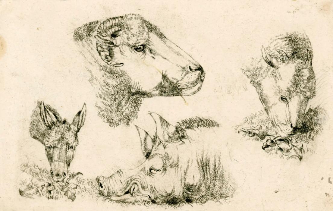 Edwin Landseer, R.A., Studies in a Farmyard; Heads of a Boar, Sheep and Donkey, 1810?, etching, © Royal Academy of Arts, London