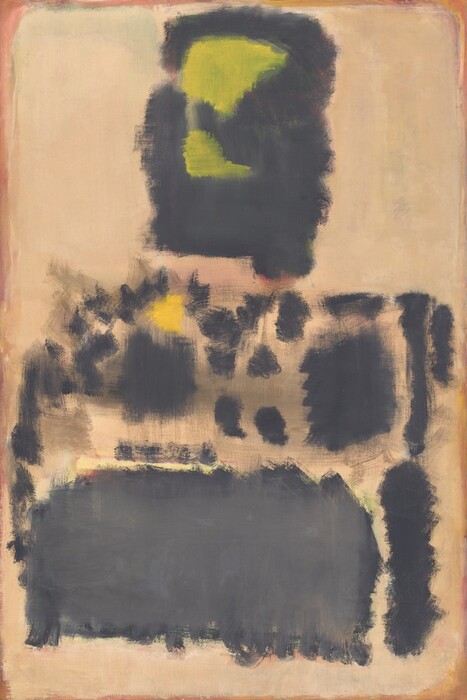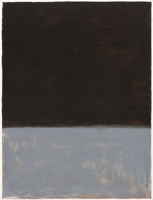 By 1947 Rothko had eliminated all elements of surrealism or mythic imagery from his works, and nonobjective compositions of indeterminate shapes emerged. Within three years he reached his signature format, painting two or three soft-edged, luminescent rectangles, stacked weightlessly on top of one another, floating horizontally against a ground. Now a recognized artist of the New York School, he was given, in 1954, a one-man exhibition by the Art Institute of Chicago. In 1958 Rothko accepted his first commission for a series of paintings for the Four Seasons restaurant. He received his second commission for murals in 1961 for the Holyoke Center at Harvard University. From 1964 to 1967 Rothko worked on his third and last commission, a Roman Catholic chapel in Houston, now interdenominational, creating fourteen canvases, numerically corresponding to the Stations of the Cross. From 1968 on, he worked in acrylic on canvas and paper, reducing his palette to brown, gray, and black.