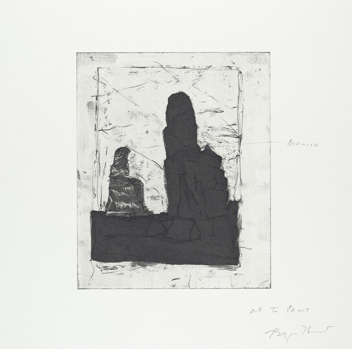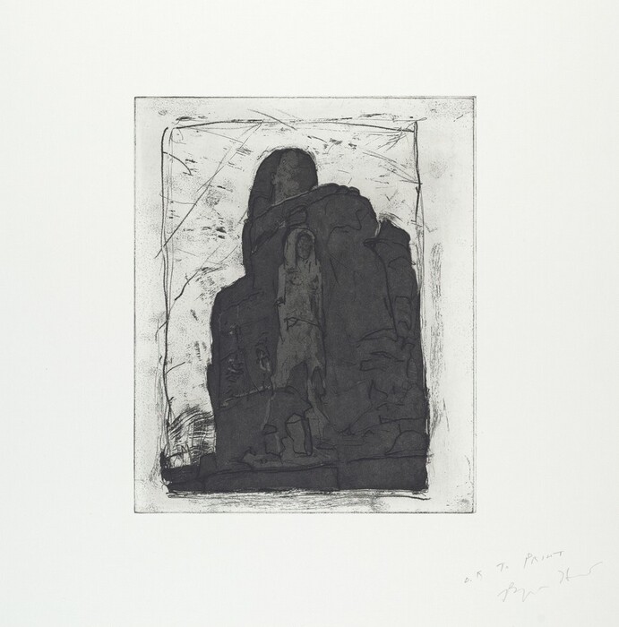 Bryan Hunt, Dena Schuckit · 1998 · soap ground and sugar lift aquatints with soft ground etching in grey and black on wove Somerset paper [working proof 4] · Accession ID 2024.132.362
