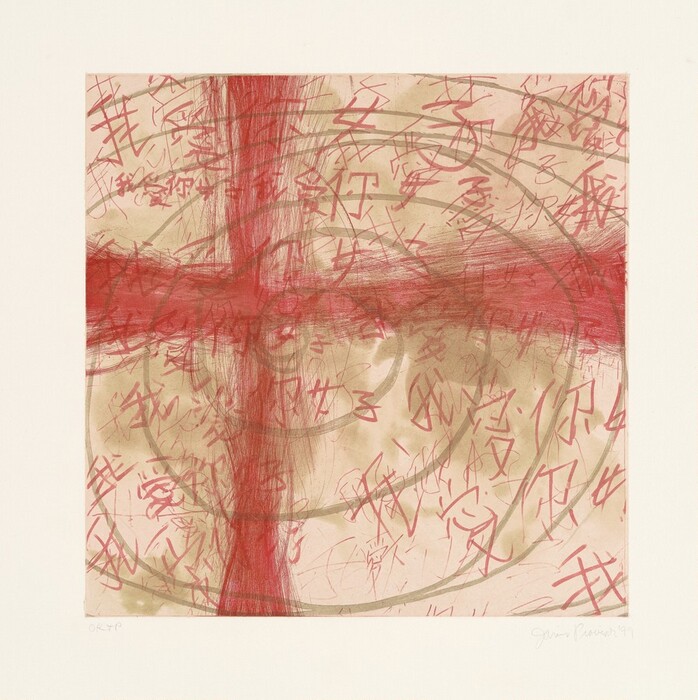 Janis Provisor, Emily York · 2004 · color spit bite and sugar lift aquatints with hard ground etching and printed collage elements on Gampi paper chine collé on Somerset paper (WP 1 – green and yellow spit bites, gold hard ground and butterflies, red spit bite Chinese writing) [working proof 1] · Accession ID 2024.132.595