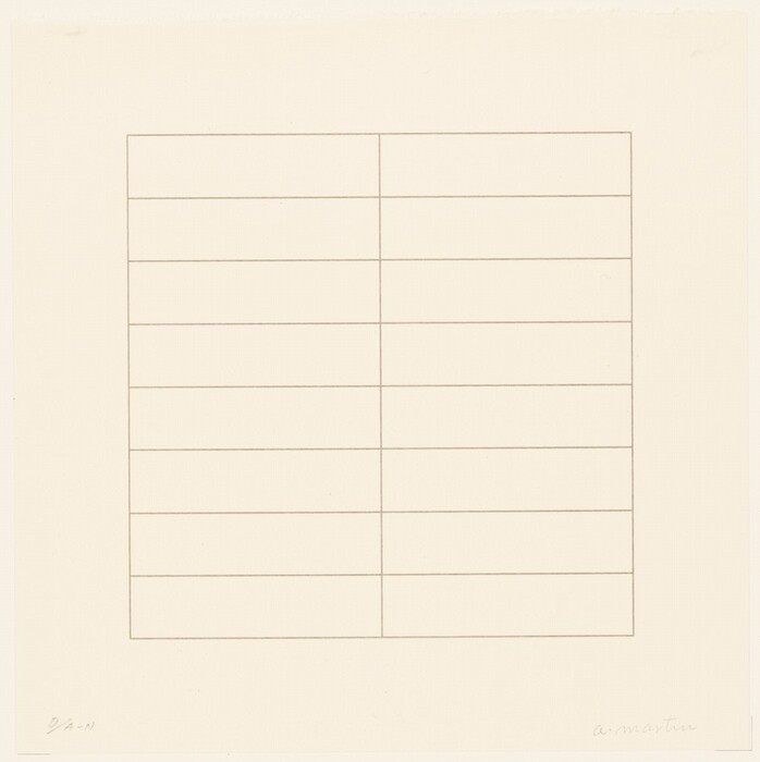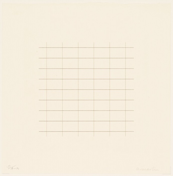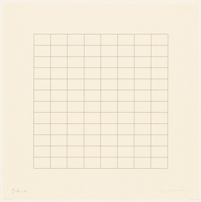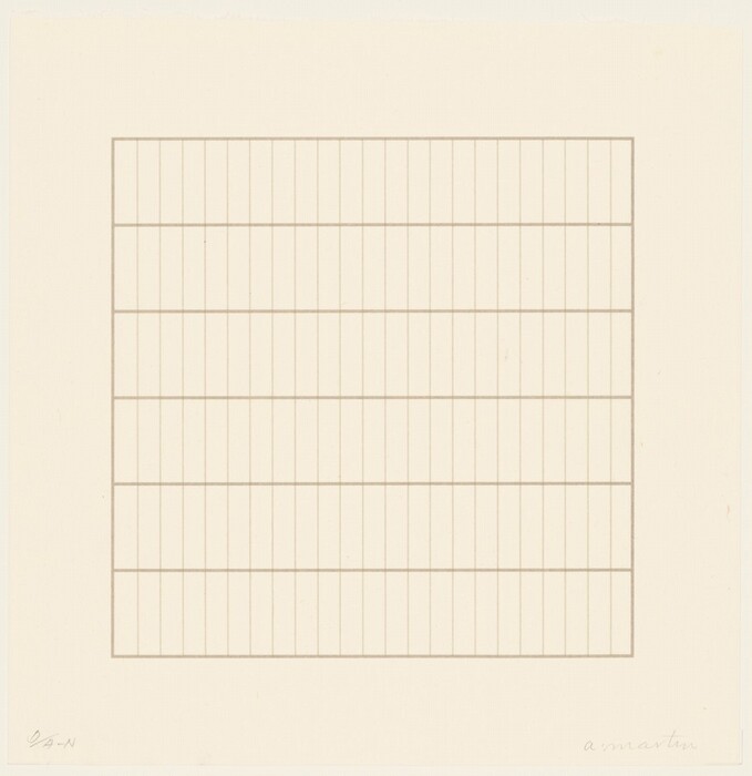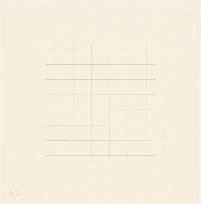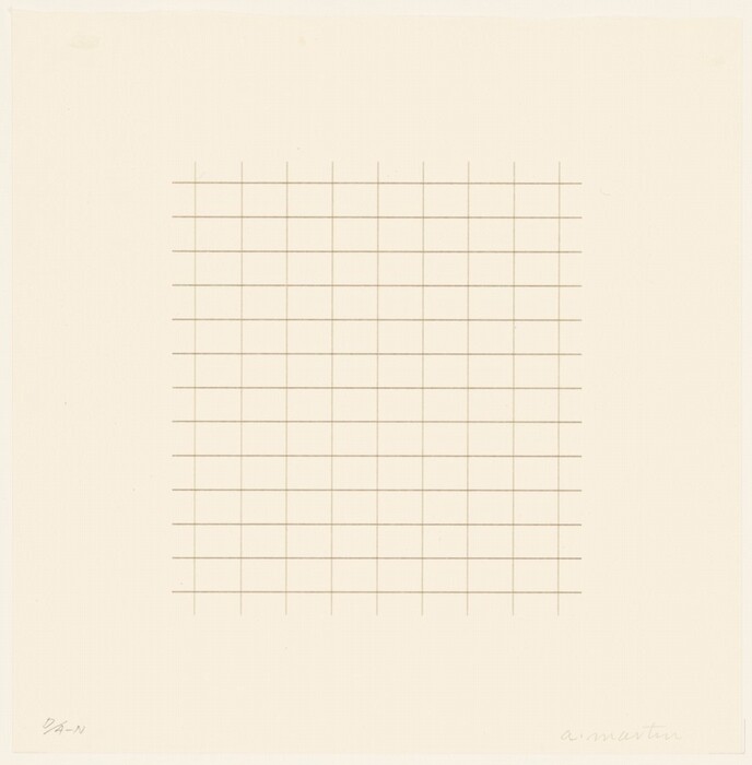 Born 22 March 1912 in the Canadian province of Saskatchewan, Agnes Martin came to the United States in 1932. In the years between receiving her undergraduate and graduate degrees from Columbia University, she worked and taught in various parts of the country. At the urging of the art dealer Betty Parsons, Martin returned to New York City in 1957. She had shifted from a realistic style to a surrealist style characterized by biomorphic forms, but by 1958 her paintings were based on ordered precisely geometric shapes. She gradually began to work on paintings and drawings that consisted of horizontal and vertical lines within a measured grid format. Martin's use of the grid and her austere, geometric style led critics to associate her with minimalist artists such as Sol LeWitt and Frank Stella. However, Martin's goals were distinctly different. By drawing fragile, tremulous lines across expanses of lightly applied, delicate, atmospheric color, her work seemed to become light and air. Art for Martin was a spiritual pursuit, and in her geometric format she found a way to embody both atmosphere and expression. In 1967 the artist settled in New Mexico, where she painted, exhibited, and wrote until her death in Taos on 16 December 2004.