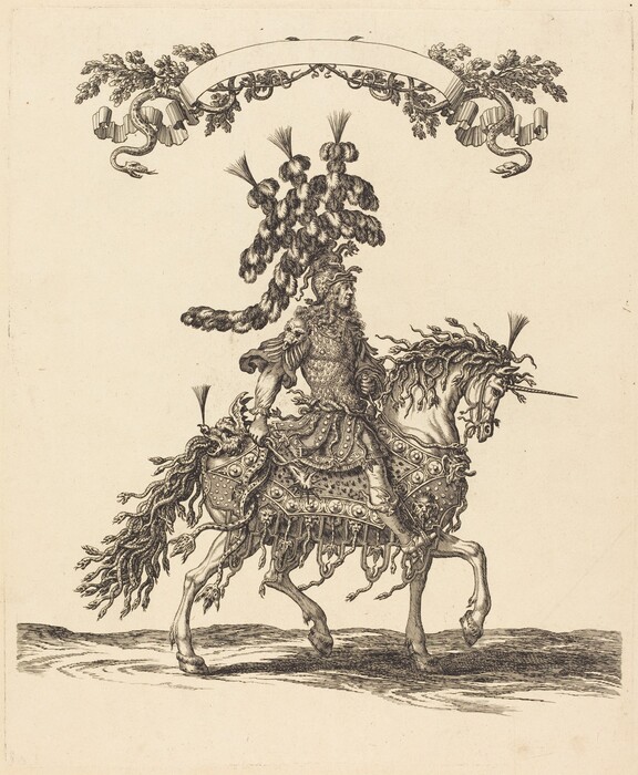 Israël Silvestre, François Chauveau, Gilles Rousselet, Charles Perrault · published 1670 · 1 vol: text by Perrault; ill: 11 double-page engravings by Silvestre (versos blank); 30 equestrian portraits (1 double-page, verso blank), 55 devices, 3 headpieces, 3 tailpieces, and various initials by Chauveau; plus engraved title page by Rousselet · Accession ID 1996.1.1