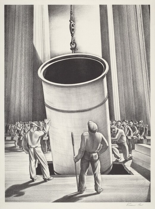 Around 1920 Kent took up wood engraving and quickly established himself as one of the preeminent graphic artists of his time. His striking illustrations for two editions of Herman Melville’s Moby Dick—simultaneously precise and abstract images that drew on his architect’s eye for spatial relations and his years of maritime adventures—proved extremely popular and remain some of his best-known works. Throughout the 1920s and 1930s, Kent produced a range of print media, including advertisements, bookplates, and Christmas cards. Kent’s satirical drawings, created under the pseudonym “Hogarth Jr.,” were published in popular periodicals including Vanity Fair, Harper’s Weekly, and Life. In 1937 the artist was commissioned by the Federal Public Works Administration to paint two murals for the New Post Office in Washington, DC.
