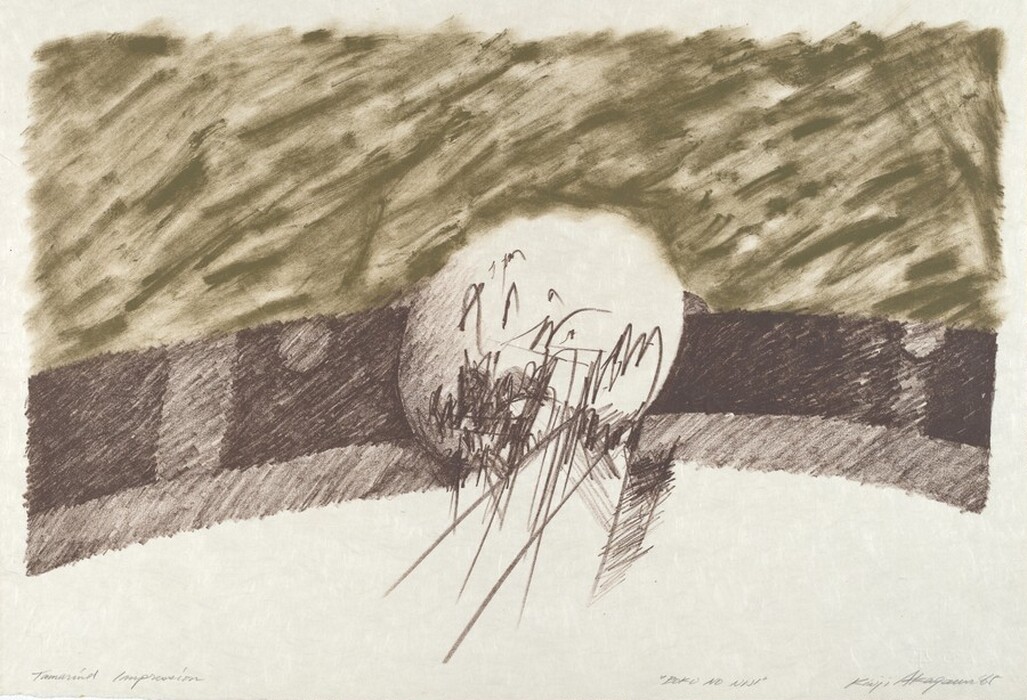Kinji Akagawa, Tamarind Institute · 1965 · lithograph (zinc) in olive green and brown on white Nacre paper · Accession ID 1983.18.78