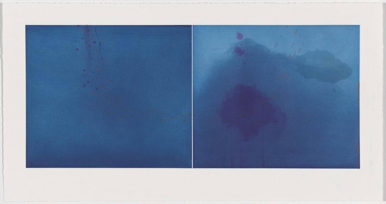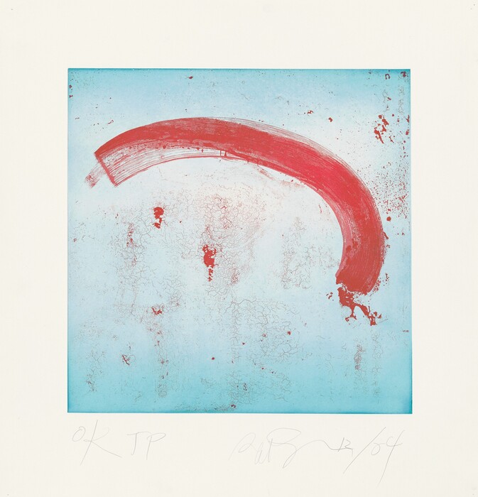 Pat Steir, Rachel Fuller · 2003 · color water bite aquatint with spit bite aquatint and drypoint on Somerset paper (WP 2 – blue water bite and spit bite red and graphite pencil drawing) [working proof 2] · Accession ID 2024.132.674
