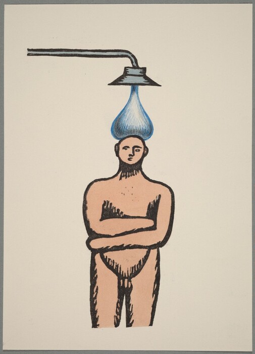 Ilya Kabakov, Scene 25, c. 1970, woodcut in black touched with watercolor, blue pencil, and graphite on wove paper; laid down on gray paper, Gift of Elaine and James D. Wolfensohn and The Dunlevy Milbank Foundation, 1993.25.26