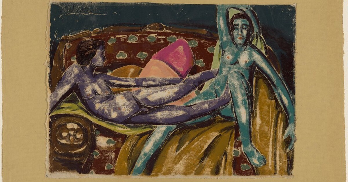 color monotype on Japanese tissue paper, attached to a sheet of wove cream paper and to a sheet of green-brown laid paper