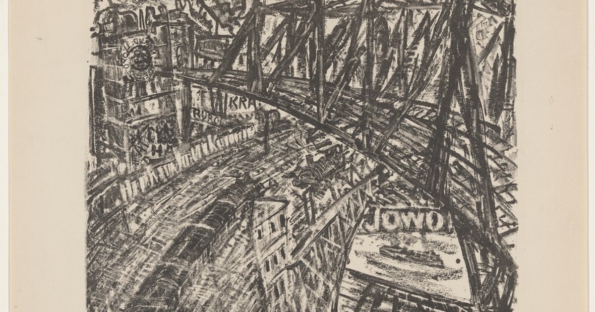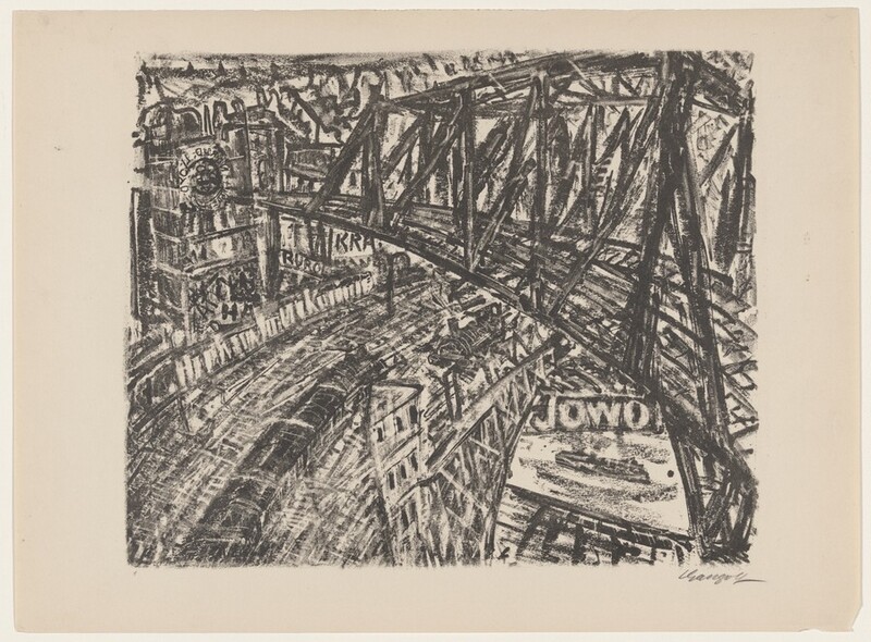 upper left in image [on clock]: NORUD LIOYO; upper left in image [under bridge]: RURO /KRA; lower right in image [under bridge]: JOWO; signed by artist, lower right, in graphite: Gangolf; by artist, lower left, in graphite: 1