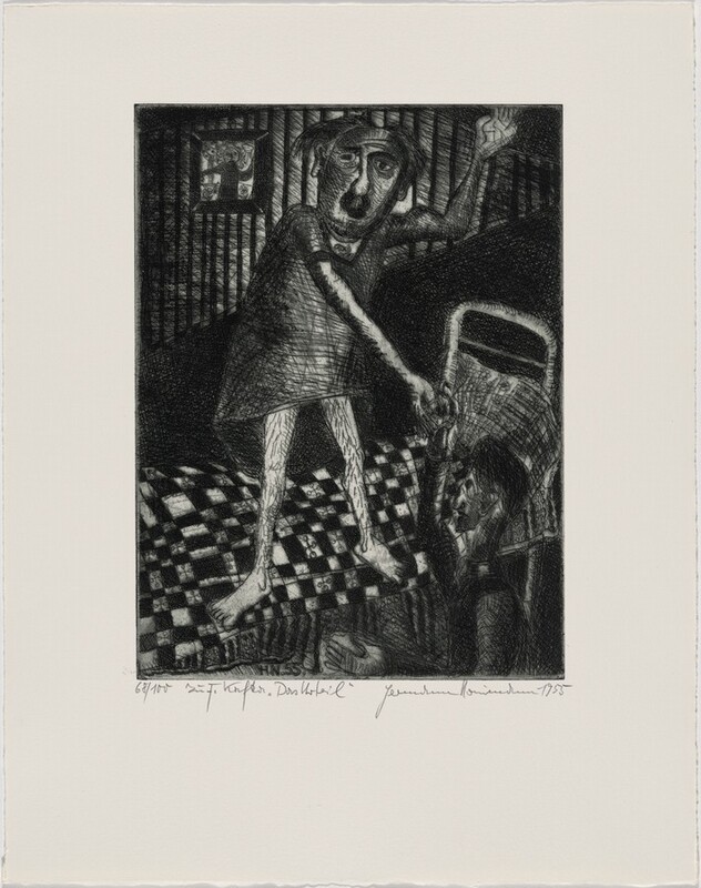 lower left in graphite: 68/100; lower center in graphite: zu F. Kafka „Das Urteil”; lower right in graphite: [undeciphered] 1955