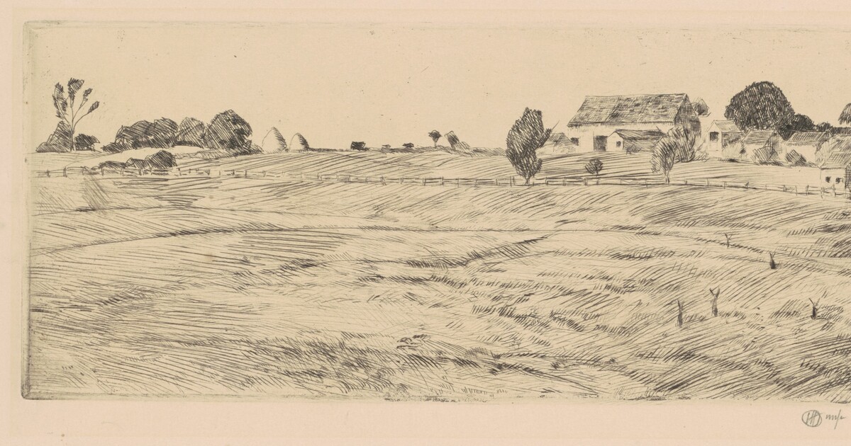 lower right in plate: May 23rd / [the artist's monogram] / 1924; lower right in graphite: [the artist's monogram] imp; lower left edge in graphite by unknown hand: Jonathan Baker Farm 2nd st.; lower center edge in graphite by unknown hand: 787HA 569HH [strikethrough]; upper left verso in graphite by unknown hand: 3 1/2" x 3"; upper right verso in graphite by unknown hand: #26