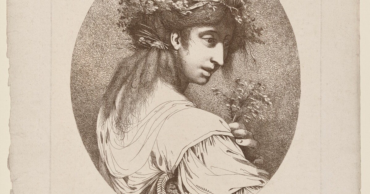 upper center in plate: OPHELIA.; lower center in plate: There's Fennel for you and Columbines / There's Rue for you and some for me. / Hamlet Act IV Scene 7 / Published May 20, 1775, by J MORTIMER, Norfolk Street, STRAND