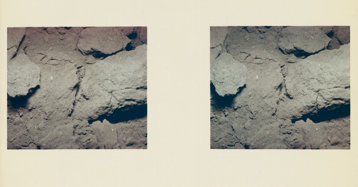 upper left printed in red ink: NASA / AS11-45-6706; on verso, upper center printed in purple ink: [NASA logo] NATIONAL AERONAUTICS AND SPACE ADMINISTRATION / HOUSTON, TEXAS 77058 / FOR RELEASE: / PHOTO NO. AS11-45-6706; upper center NASA copyright stamp in purple ink; center printed in purple ink: COLOR / 20 JULY 1969 / AS11-45-6706 / MANNED SPACECRAFT CENTER, HOUSTON, TEXAS / LUNAR SURFACE STEREO CLOSE-UP----- An Apollo 11 stereo view showing / a clump of lunar surface powder, with various small pieces of dif- / ferent color. Many small, shiny spherical particles can be seen. / The picture is three inches across. The exposure was made by the / Apollo 11 35mm stereo close-up camera. The camera was specially / developed to get the highest possible resolution of a small area. / A three-inch square area is photographed with a flash illumination / and at a fixed distance. The camera is mounted on a walking stick, / and the astronauts use it by holding it up against the object to be / photographed and pulling the trigger. The pictures are in color and / give a stereo view, enabling the fine detail to be seen very clearly. / The project is under the direction of Prof. T. Gold of Cornell Uni- / versity and Mr. F. Pearse of NASA. The camera was designed and built / by Eastman Kodak. Prof. E. Purcell of Harvard University and Dr. E. / Land of the Polaroid Corporation have contributed to the project. / The pictures brought back from the Moon by the Apollo 11 crew are of / excellent quality and allow fine detail of the undisturbed lunar / surface to be seen. Scientists hope to be able to deduce from them / some of the processes that have taken place that have shaped and / modified the surface.