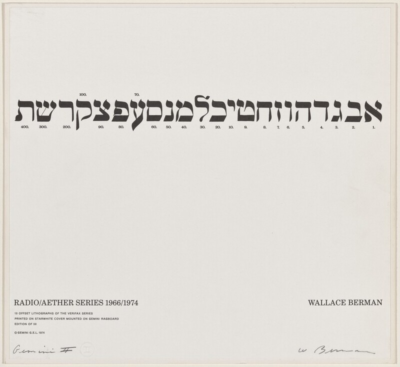 TITLE PAGE. lower left on plate: Radio/Aether Series 1966/1974 / 13 Offset Lithographs of the Verifax Series / Printed on Starwhite Cover mounted on Gemini Ragboard / Edition of 50 / © Gemini G.E.L. 1974; lower right on plate: Wallace Berman; lower left in graphite: Gemini II; lower right in graphite: W Berman; lower right verso in graphite by unknown hand: WB74-683