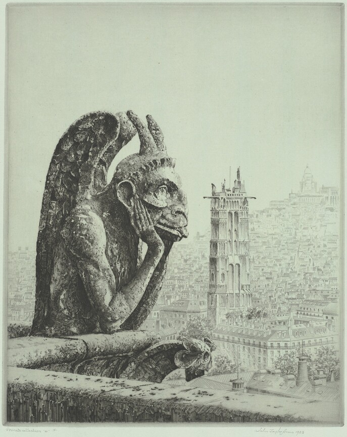 Sketch a gargoyle inspired by John Taylor Arms’ Le penseur de Notre Dame.