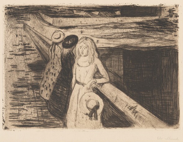 "Edv Munch" lower right margin, graphite. Not dated. "Sch 200. "Mädchen auf der Landungsbrücke" lower left margin, graphite, unknown hand. "K4849" lower right margin, graphite, unknown hand. "NY / 9415" verso, lower sheet, written twice, graphite, unknown hand. "70" verso, lower left sheet, graphite, unknown hand.