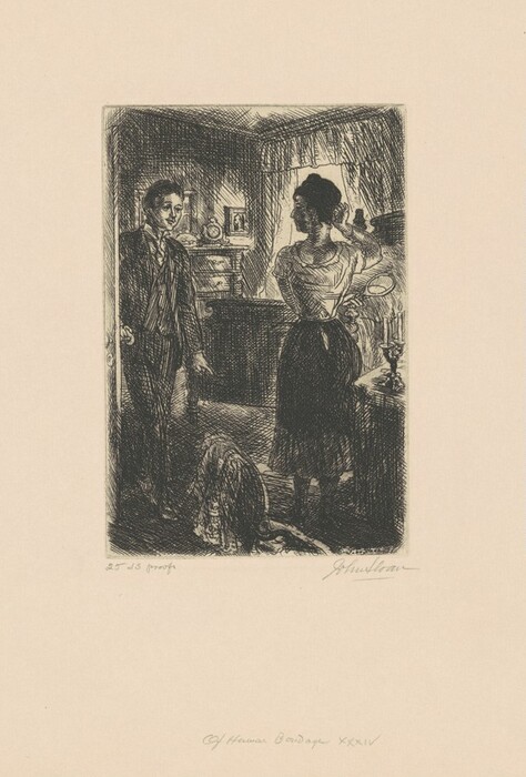 John Sloan was born in Lock Haven, Pennsylvania, on August 2, 1871, the son of an amateur artist and occasional businessman. In 1876 he moved with his family to Philadelphia and in 1884 enrolled in Central High School, where William Glackens and Albert C. Barnes were among his classmates. In 1888 he began working for a bookseller and print dealer, and the following year he taught himself how to etch with the aid of Philip Gilbert Hamilton's The Etcher's Handbook. In 1891 Sloan attended drawing classes at the Spring Garden Institute and began to work as a freelance commercial artist. He joined the art department of the Philadelphia Inquirer in 1892, and studied drawing at the Pennsylvania Academy of Fine Arts under Thomas Pollock Anshutz. In 1893 he became one of the founders of the Charcoal Club, a group of young artists who broke away from the academy. From 1895 to 1903 he worked for the Philadelphia Press. Inspired by Robert Henri, Sloan started to paint in the late 1890s, beginning with portraits and Philadelphia city scenes. He exhibited for the first time at the Pennsylvania Academy in 1900.