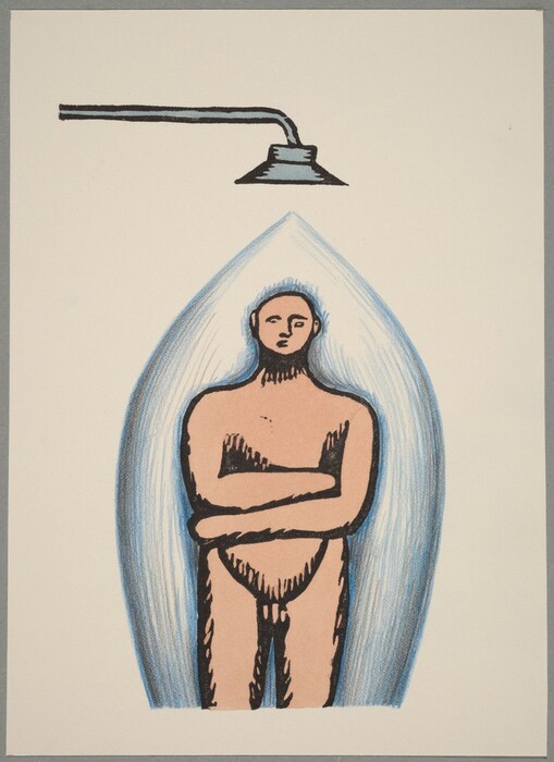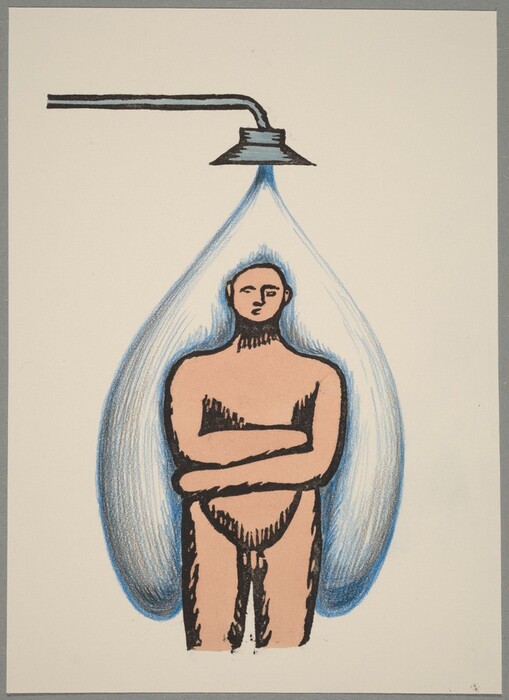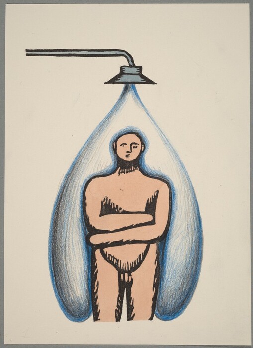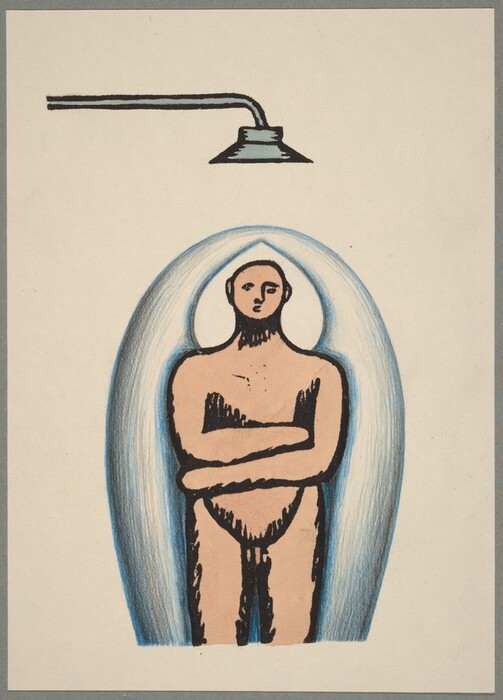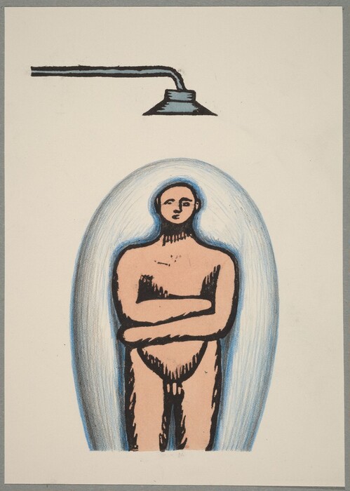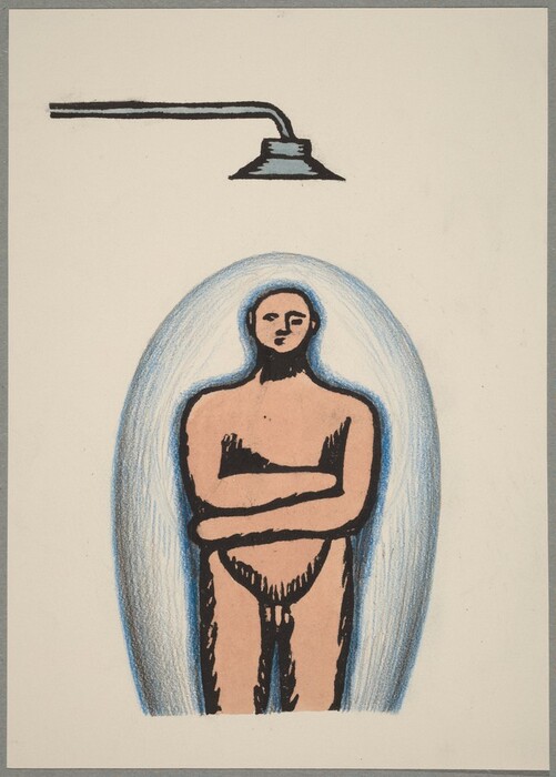 Ilya Kabakov, Scene 25, c. 1970, woodcut in black touched with watercolor, blue pencil, and graphite on wove paper; laid down on gray paper, Gift of Elaine and James D. Wolfensohn and The Dunlevy Milbank Foundation, 1993.25.26