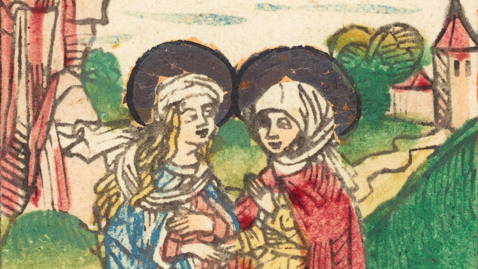 German 15th Century, The Visitation, c. 1480/1490, woodcut in dark brown, hand-colored in red, yellow, green, lt. blue, pink, blue, gold, orange, Rosenwald Collection, 1943.3.824