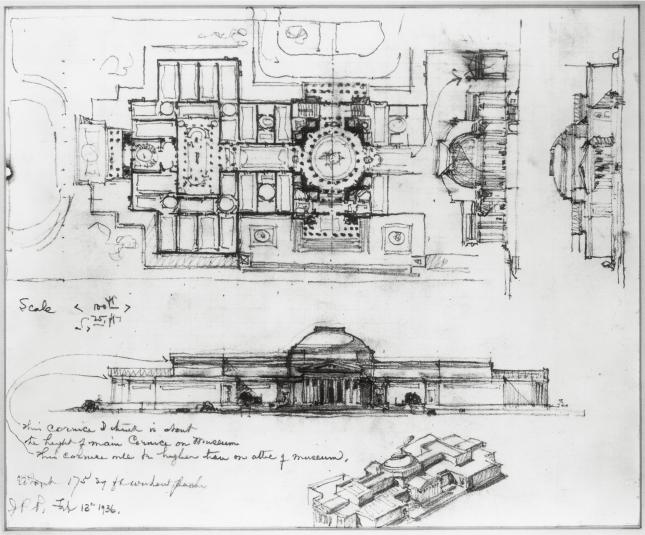 Conceptual drawing for the National Gallery of Art by John Russell Pope, February 1936. Photostat of lost original. National Gallery of Art Archives.