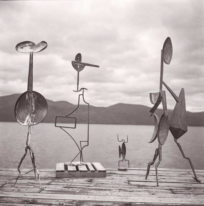 Tanktotem IV, Bicycle, 7/29/53, and Taktotem III, all 1953, at Bolton Landing dock, Lake George, New York, c. 1953. Photo: David Smith. © 2025 The Estate of David Smith / Licensed by VAGA at Artists Rights Society (ARS), NY